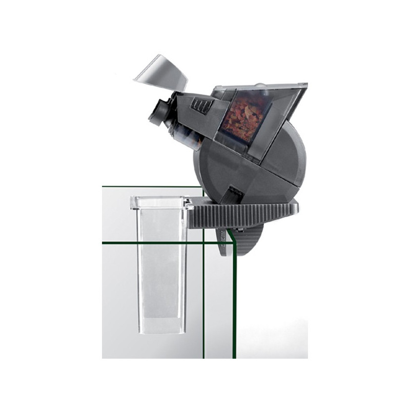 Durchdachte Konstruktion: Gerät mit Futterzylinder (Düse) und abnehmbarer Plattform. Plattform dient als Auflage für die Futterspender Eheim AutoFeeder und Eheim TwinFeeder.
