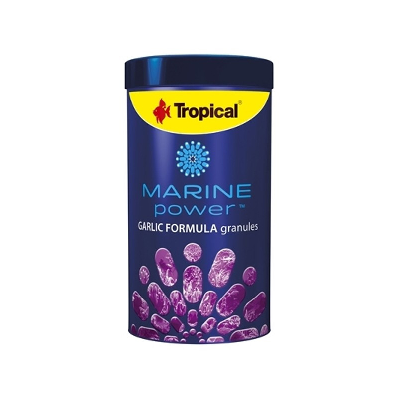 TROPICAL Marine Garlic Formula 250ML ist Futter in Form von sinkendem Granulat mit einem hohen Knoblauchgehalt (30 %) zur täglichen oder Ergänzungsfütterung von allesfressenden Meeresfischen.