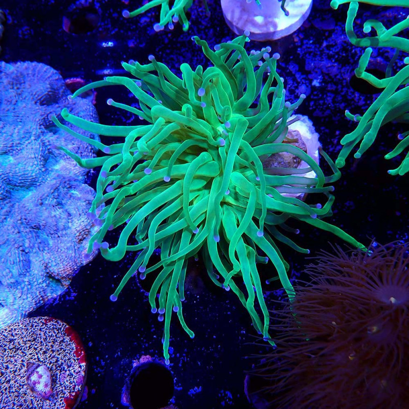 | Agressivité : Tentacules urticants nocturnes pouvant atteindre ~10–15 cm ; prévoir un espace suffisant pour éviter les brûlures aux coraux voisins. |
