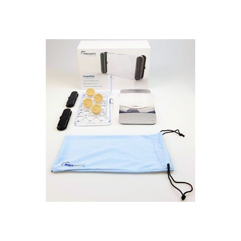 Maxspect Fragnifier est une loupe acrylique avec aimants nettoyants de vitre et un porte-accessoires en option fournis avec 18 Bio-Plugs.