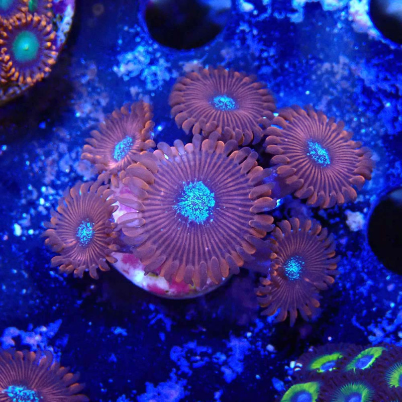 Éclairage : Faible à moyen (≈ PAR 80–150). Les Zoanthus tolèrent différents niveaux de lumière mais développent de plus belles couleurs sous un éclairage modéré.